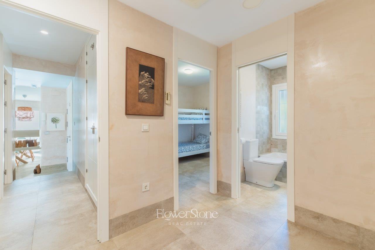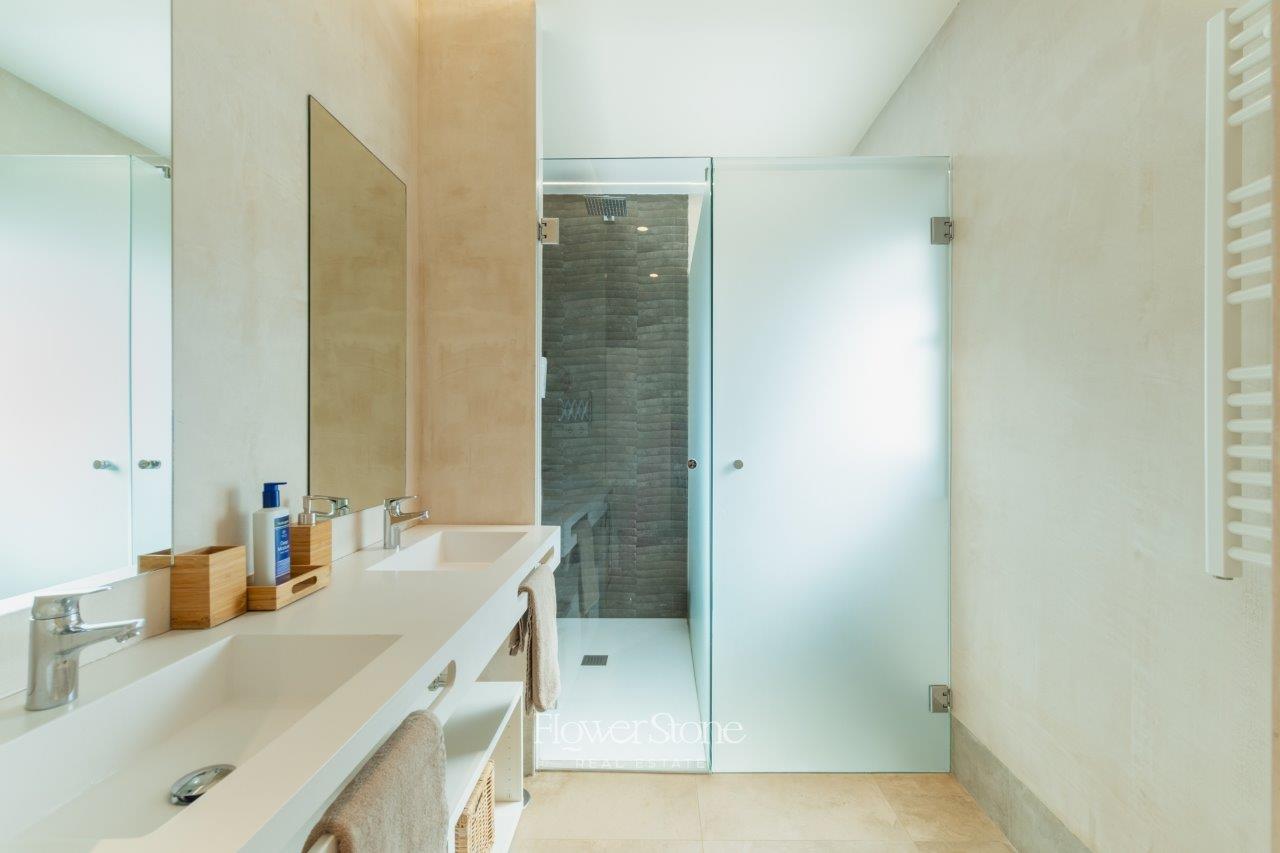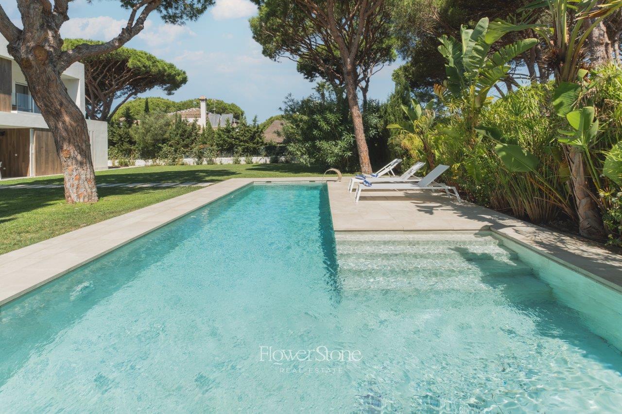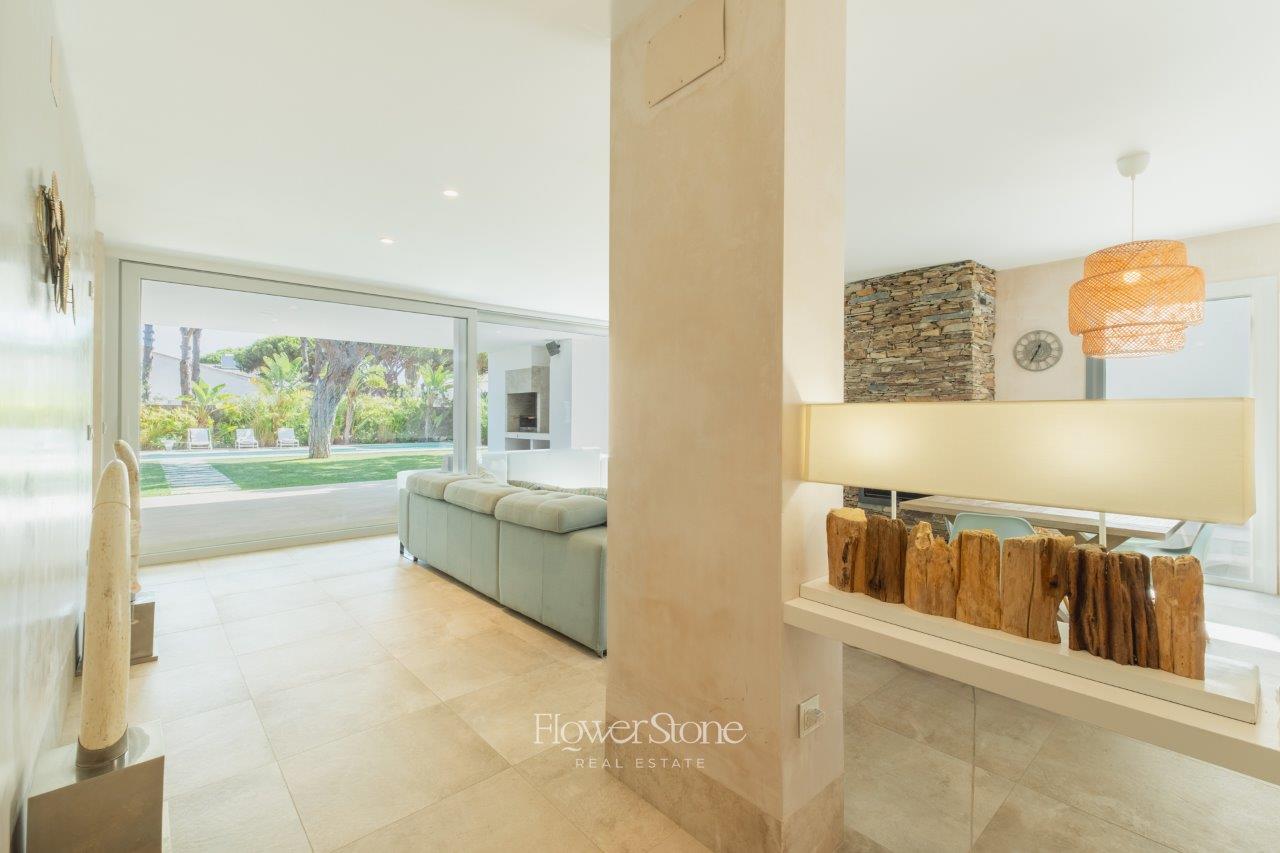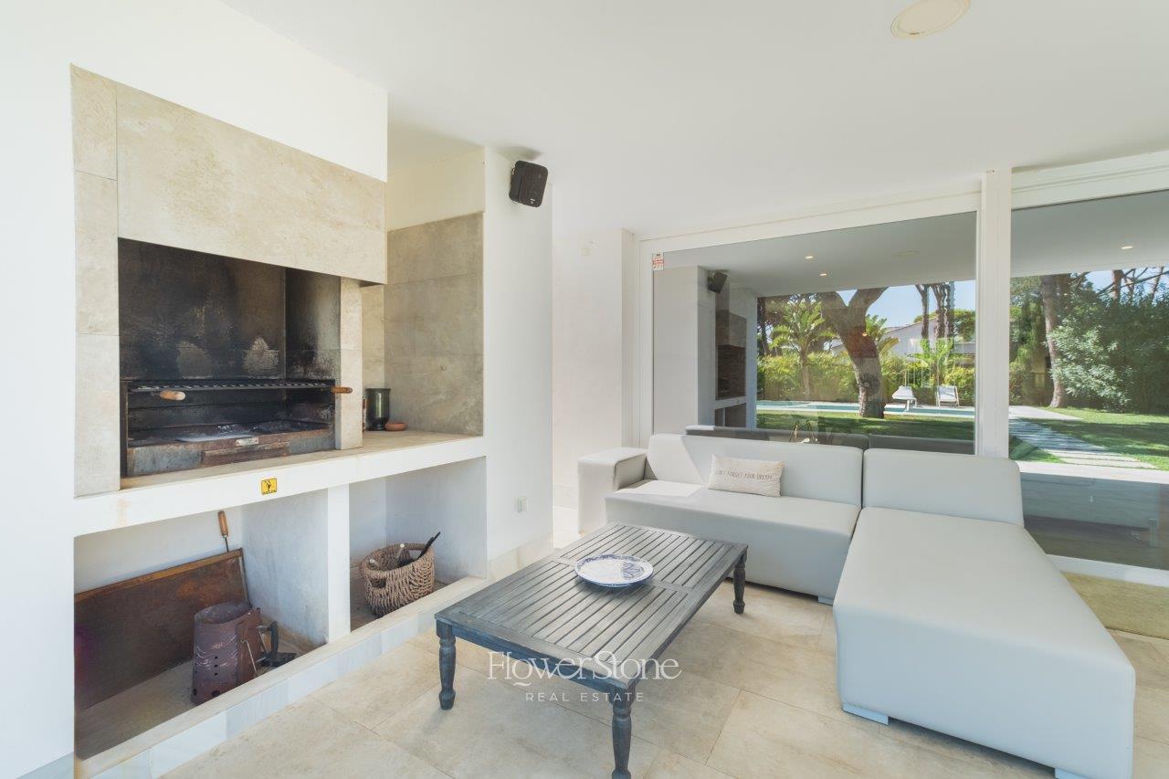 Con capacidad para 9 personas, la villa cuenta con 5 amplios dormitorios, 4 baños en el interior y uno exterior, todos equipados para garantizarte una estancia de ensueño. La cocina está completamente equipada, perfecta para preparar deliciosas comidas que podrás disfrutar en el amplio porche exterior, con su acogedora zona chill out y una barbacoa de obra para tus momentos más especiales. Además, la impresionante piscina de cloración salina, con cascada y ducha de agua caliente, será tu rincón favorito para relajarte bajo el sol.